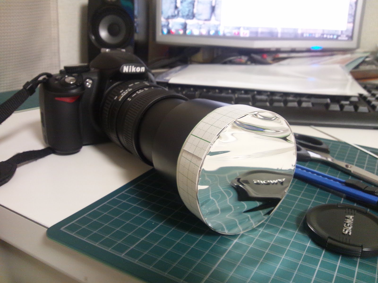アストロソーラーのND5のシート+方眼紙と両面テープでこしらえた日食撮影用フィルタ。